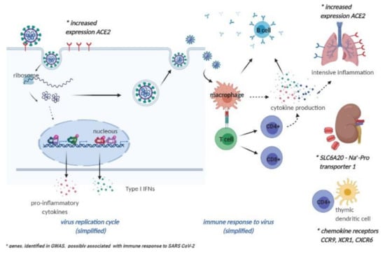 Genes identified in genome association studies (GWASs), possibly related to the immune response to SARS-CoV-2. (Adapted from “Coronavirus Replication Cycle”, by BioRender.com (2020). Retrieved from https://app.biorender.com/biorender-templates).