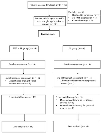 In total, 36 women were recruited, and 32 women (52.6 ± 10.4 years) diagnosed with FMS who met the inclusion criteria were enrolled in the clinical trial. They were randomly assigned to the PNE + TE group (n = 16) or the TE group (n = 16). Four patients dropped out during the study for personal reasons. A flowchart of the recruitment and follow-up of participants is shown in Figure 2. The M ± SD for demographic and clinical characteristics and differences between groups at T0 are shown in Table 1. There were no statistically significant differences between groups in any of the sociodemographic or dependent variables at baseline (p > 0.05).