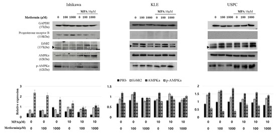 Expression of progesterone receptor B, ErbB2, AMPKα, and phospho-AMPKα in three endometrial cancer cell lines (Ishikawa, KLE, and USPC) according to treatment with different dose combinations of medroxyprogesterone (MPA) (0, 10 µM) and metformin (0, 100, 1000 µM). Band densities are quantified using ImageJ and values are presented as mean ± S.E. of independent triplicates per group. Progesterone receptor B, ErbB2, and AMPKα were normalized to GAPDH, whilst p-AMPKα was normalized to AMPKα.