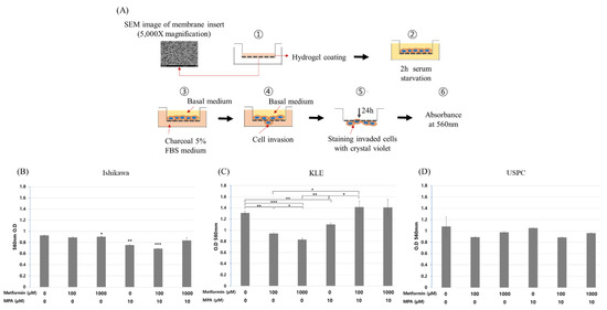 Invasion assay in three endometrial cancer cell lines (Ishikawa, KLE, and USPC). (A) The process of invasion assay, cell invasion after treatment of different dose combinations of medroxyprogesterone (MPA) (0, 10 µM) and metformin (0, 100, 1000 µM) in Ishikawa (B), KLE (C), and USPC cells (D). (B) All comparisons were with control (no metformin/MPA). (B–D) Each experiment was independently performed in triplicate: results are expressed as mean ± standard deviation. Multiple testing correction was performed using Bonferroni adjustment and Bonferroni corrected p-values were used for statistical significance (B–D). * p < 0.05, ** p < 0.005, *** p < 0.0005.