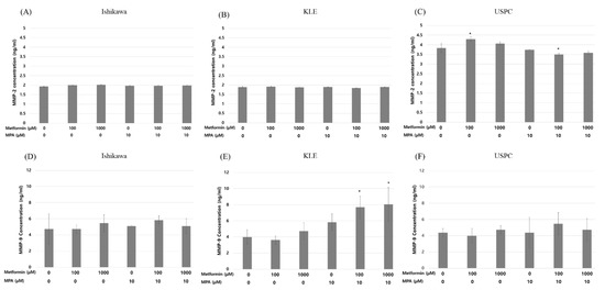 Matrix metallopeptidase (MMP)-2 (A, Ishikawa; B, KLE; C, USPC) and MMP-9 (D, Ishikawa; E, KLE, F, USPC) in three endometrial cancer cell lines after treatment with different dose combinations of medroxyprogesterone (MPA) (0, 10 µM) and metformin (0, 100, 1000 µM). Each experiment was independently performed in triplicate: results are expressed as mean ± standard deviation. Multiple testing correction was performed using Bonferroni adjustment and Bonferroni corrected p-values were used for statistical significance. * p < 0.05.