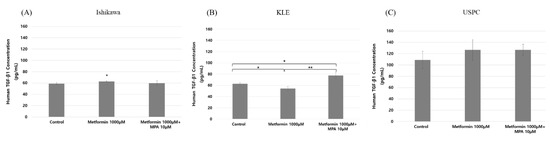 Transforming growth factor (TGF)-β1 in three endometrial cancer cell lines after treatment with different dose combinations of medroxyprogesterone (MPA) (0, 10 µM) and metformin (0, 1000 µM) in Ishikawa (A), KLE (B), and USPC cells (C). Each experiment was independently performed in triplicate: results are expressed as mean ± standard deviation. Multiple testing correction was performed using Bonferroni adjustment and Bonferroni corrected p-values were used for statistical significance. * p < 0.05, ** p < 0.005.