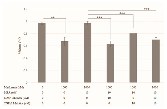 Cell invasion after combination treatment of 1mM metformin (Met), 10 µM medroxyprogesterone (MPA), 10 µM Matrix metallopeptidase (MMP) inhibitor and transforming growth factor (TGF)-β inhibitor in KLE cell lines. Each experiment was independently performed in triplicate: results are expressed as mean ± standard deviation. Multiple testing correction was performed using Bonferroni adjustment and Bonferroni corrected p-values were used for statistical significance. ** p < 0.005, *** p < 0.0005.
