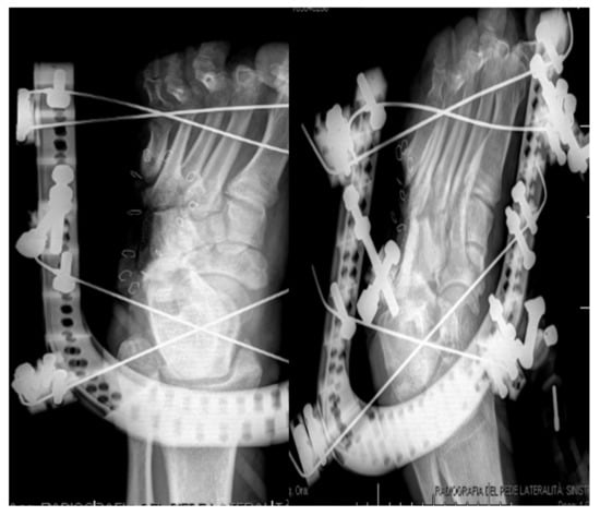 - Paola, L.D.; Ceccacci, T.; Ninkovic, S.; Sorgentone, S.; Marinescu, M.G.; Volpe, A. Limb salvage in Charcot foot and ankle osteomyelitis: Combined use single stage/double stage of arthrodesis and external fixation. Foot Ankle Int. 2009, 30, 1065–1070. [Google Scholar] [CrossRef]