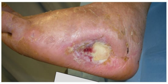 Below we report one of the cases of a calcaneal ulceration with chronic osteomyelitis. The patient was a 69 year-old male, diagnosed with diabetes (type 2), hypertension, and dyslipidaemia. Recurrence of a neuro-ischemic ulceration of his left heel occurred three years after previous resection of the ulcer, partial calcanectomy and skin grafting (Figure 1). The lesion was graded IIID according to Texas University Classification.