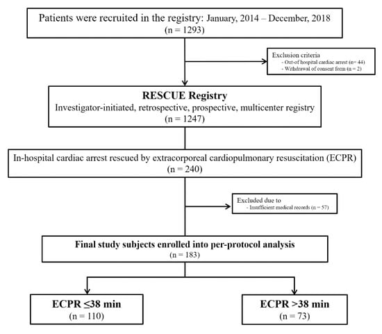 The RESCUE (REtrospective and prospective observational Study to investigate Clinical oUtcomes and Efficacy of left ventricular assist device for Korean patients with cardiogenic shock; NCT02985008 at www.clinicaltrials.gov) study is a multi-center registry of patients with cardiogenic shock aged over 19 years. Between January 2014 and December 2018, a total of 1247 patients were enrolled from 12 tertiary centers in the Republic of Korea. More detailed information regarding prospective and retrospective enrollments of each institute is shown in Table A1. The inclusion criteria were as follows: (1) systolic blood pressure < 90 mmHg for 30 min or the need for inotrope or vasopressor support to achieve a systolic blood pressure > 90 mmHg and (2) the presence of pulmonary congestion and signs of impaired organ perfusion (altered mental status, cold periphery, oliguria < 0.5 mL/kg/hour for the previous 6 h, or blood lactate > 2 mmol/L). Exclusion criteria were (1) out-of-hospital cardiac arrest and (2) evidence of septic or hypovolemic shock. For this study, we evaluated 240 patients with IHCA rescued by ECPR. Fifty-seven of those patients were excluded due to insufficient medical records. Finally, 183 patients were divided into two groups according to a mean ECPR time of 38 min, the same value as in the risk prediction model of survival to discharge, in which a 38-min ECPR time was defined as an intra-ECPR factor in the prognostic scoring system [11] (Figure 1). The institutional review board of each hospital approved the study protocol and waived the requirement for written informed consent for patients enrolled in this retrospective registry. We obtained informed consent from the patients enrolled in the prospective registry.
