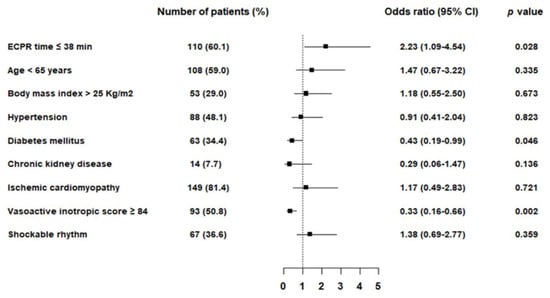 In multivariable logistic regression analysis, ECPR ≤ 38 min (odds ratio [OR] 2.23; 95% confidence interval [CI] 1.09–4.54; p = 0.031) was an independent predictor of favorable survival to discharge. Negative predictors of survival discharge were diabetes mellitus (OR 0.43; 95% CI 0.19–0.99; p = 0.046) and VIS ≥ 84 (OR 0.33; 95% CI 0.16–0.66; p = 0.002) (Figure 2). The adverse relationship between ECRP duration and survival to discharge or good neurologic outcomes at discharge is shown in Figure A1.