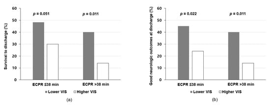 Subgroup analysis was performed to analyze the relationship between clinical outcomes and VIS or ECPR time. Patients were divided into the lower VIS and higher VIS subgroups according to median VIS (=84) in both ECPR ≤ 38 min and ECPR > 38 min groups. In the ECPR > 38 min group, the incidence of survival to discharge was significantly lower in the higher VIS subgroup than in the lower VIS subgroup (14.0% versus 40.0%, p = 0.011). The higher VIS subgroup exhibited a significantly lower incidence of good neurologic outcomes at discharge compared to the lower VIS subgroup in both ECPR time groups, with higher significance observed in the ECPR > 38 min group than in the ECPR ≤ 38 min group (p = 0.011 and p = 0.022, respectively) (Figure 3).