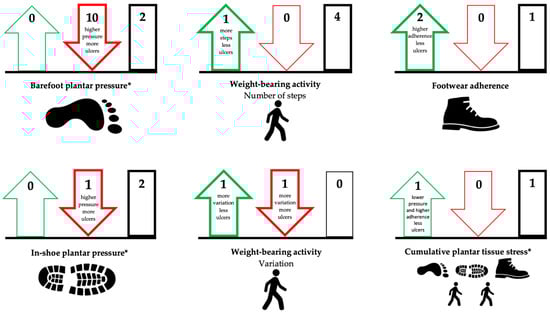 For cumulative plantar tissue stress, we included one publication investigating a direct association with ulcer development (one randomized controlled trial). Waaijman et al. [12] (n = 171, e = 71) combined barefoot and in-shoe plantar pressure, weight-bearing activity (i.e., number of daily steps) and footwear adherence to determine the cumulative plantar tissue stress on the foot. Cumulative plantar tissue stress was higher in people who developed a recurrent plantar ulcer (715 ± 538 MPa⋅s/day) or a recurrent ulcer from unrecognized trauma (423 ± 292 MPa⋅s/day) compared to people who did not develop a plantar ulcer (652 ± 436 MPa⋅s/day) or an ulcer from unrecognized trauma (361 ± 279 MPa⋅s/day), respectively (see for details Table S7). However, the associations between cumulative plantar tissue stress and risk of ulcer development were not statistically significant (p = 0.453 and p = 0.162, respectively). The percentage of people with an in-shoe peak plantar pressure of <200 kPa and footwear adherence >80% was lower in those who developed a recurrent plantar ulcer (9.0%) or a recurrent ulcer from unrecognized trauma (17.9%) compared to people who did not develop a plantar ulcer (10.2%) or an ulcer from unrecognized trauma (27.3%), respectively. These associations were statistically significant (p = 0.012 and p = 0.019, respectively) [12]. These results seem to suggest that higher cumulative plantar tissue stress increases the risk of ulcer development (QoE: low) (Table 1; Figure 2).
