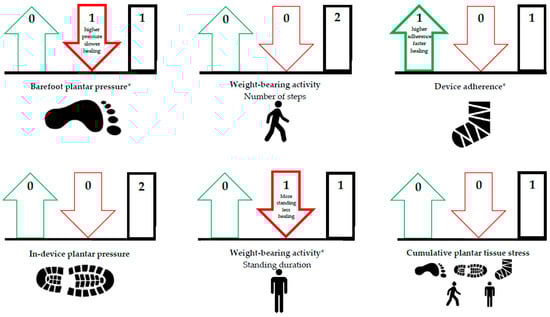 For cumulative plantar tissue stress, we included one publication investigating a direct association with ulcer healing (one prospective cohort). Van Netten et al. [13] (n = 31, e = 21) combined in-device plantar pressure and weight-bearing activity (i.e., number of daily steps) to determine a cumulative plantar tissue stress index. Cumulative plantar tissue stress was lower in people who healed from a plantar ulcer (155 ± 131 MPa⋅s/day) compared to those who did not heal from a plantar ulcer (207 ± 215 MPa⋅s/day) (see for details Table S11). Among people who self-reported to be adherent to wearing their devices, cumulative plantar tissue stress was lower in people who had ≥75% ulcer area reduction at 4 weeks compared to those who had <75% ulcer are reduction at 4 weeks (140 ± 137 and 275 ± 209 MPa⋅s/day, respectively) [13]. However, both associations were not statistically significant (p = 0.71 and p = 0.09). These results seem to suggest that lower cumulative plantar tissue stress increases the chance of ulcer healing (QoE: low) (Table 1; Figure 3).