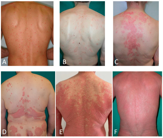 Erythroderma is clinically defined as erythema and scaling involving more than 80% of the body surface area. Additional findings include hair loss and onycholysis. Systemic symptoms include malaise, fatigue, anorexia, fever, and chills. Patients with erythroderma may develop lymphadenopathy, hepatomegaly, splenomegaly, and electrolyte abnormalities due to increased transepidermal water loss. Cardiac failure may occur in patients with pre-existing heart conditions [58]. Erythroderma is a reaction pattern of the skin that can occur in the setting of several different skin disorders, most commonly including psoriasis, dermatitis, lymphoma, drug reactions, and pityriasis rubra pilaris [59]. The development of erythrodermic psoriasis can be triggered by the withdrawal of systemic corticosteroid treatment, erroneous topical therapy, and chloroquine or lithium administration. Clinical clues for psoriatic erythroderma include a pre-existing history of plaque or pustular psoriasis, nail psoriasis, psoriatic arthritis and the sparing of the central face. Skin biopsy for histological examination is needed for differential diagnosis.