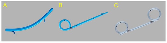 Figure 1. Plastic stents are made of polyethylene or Teflon and are available in varying sizes, shapes, and lengths for endoscopic ultrasound-guided drainage. (A) Straight “Amsterdam” type stent. (B) Single pigtail configuration helps anchor the stent for preventing inward migration. (C) Double pigtail configuration helps anchor the stent for preventing bidirectional migration.