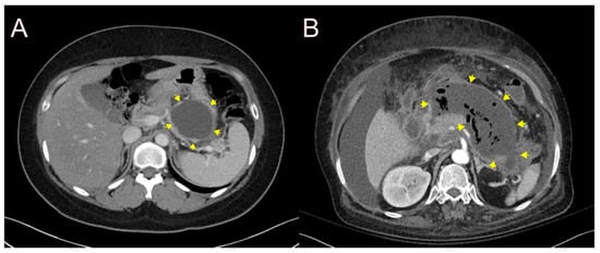 Figure 4. (A) A pseudocyst is defined as an encapsulated collection of fluid with a well-defined inflammatory wall, and is usually located outside the pancreas with minimal or no necrosis (yellow arrows pointing at the borders of the pseudocyst). (B) A walled-off necrosis (WON) is defined as a mature, encapsulated collection of peripancreatic necrosis that has developed a well-defined inflammatory wall with heterogeneous, non-liquid components in the retroperitoneum (yellow arrows pointing at the borders of the WON).