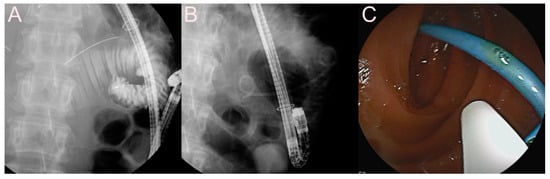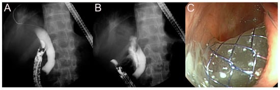 EUS-guided entero-enteric anastomosis creation has been applied to the management of the afferent loop syndrome or GOO [77,78,79]. The ideal stents for this procedure may include a bi-flanged LAMS (AXIOS or SPAXUS), which may provide long-term luminal patency for the free passage of food materials without surgical limitations (Figure 16). In the largest series [80] of 26 patients with GOO treated by EUS-guided gastrojejunostomy (GJ) creation using a LAMS, the technical success rate was 92%, whereas the clinical success rate (clinical success was defined as the tolerability of oral diet) was 85%. In another study, [81] Itoi et al. used a specially designed double-balloon enteric tube to create a window for transgastric puncture. In the EUS-guided creation of entero-enteric anastomosis, the most important factor, instead of the stent type, is the creation of a window for an initial transgastric puncture, which is categorized within the direct EUS-guided GJ (water-immersion technique) and the balloon-assisted EUS-guided GJ techniques.