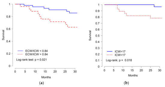 Survival was determined after a median follow-up of 620 (IQR 248–961) days. In this period, 15 fatal events occurred, due to cardiovascular causes (n = 5), infection (n = 3), chronic disease deterioration (n = 4), neoplasia (n = 2), and unknown causes (n = 1). Baseline ICW levels of those who died were significantly lower than for survivors (15.09 ± 2.357 vs. 18.87 ± 4.525 L; p = 0.004). No other body fluid parameter displayed statistically significant differences, although there were non-significant trends to higher ECW/ICW ratio (0.779 ± 0.133 vs. 0.881 ± 0.100; P = 0.054), higher OH indicator (−0.85 ± 1.753 vs. 0.071 ± 1.186 L; p = 0.181), and lower TBW (33.08 ± 6.693 vs. 28.34 ± 4.108 L; p = 0.073) in patients who died (Figure 2). Despite the low number of events, Kaplan–Meier analysis showed that patients with lower ICW (p-value 0.018) and higher ECW/ICW ratio (p-value 0.021) were at increased risk of death, the cut-off values for maximum discrimination of all-cause mortality being ECW/ICW ratio 0.84 and ICW 17L (Figure 3).