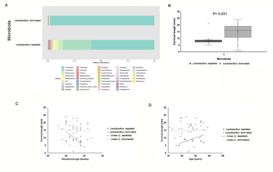 Survey of vaginal microbiota and correlation with cervical length. (A) Overview of vaginal microbiota grouped by Lactobacillus-depleted and Lactobacillus-dominated microbiota types. In each barplot, the percentage of relative abundances at the genus level is showed. (B) Differences in cervical length between women with Lactobacillus-depleted microbiota and women with Lactobacillus-dominated microbiota. Data are presented as box and whisker plots, with boxes extending from the 25th to 75th percentile and horizontal lines representing the median. Whiskers extend 1.5 times the interquartile range from the 25th and 75th percentile. Statistical analysis was performed by Mann–Whitney assay. p-value < 0.05 was considered as significant. (C,D) Analysis of covariance (ANCOVA) with grouping variables and covariates (C) age and (D) gestational age at sampling. Scatter plot with regression lines for the two groups (Lactobacillus-depleted/Lactobacillus-dominated microbiota).