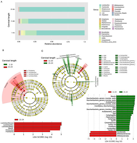 Microbiome profiles in vaginal samples according to cervical shortening categorization. (A) Barplot of vaginal swab samples was stratified based on cervical shortening (1–10 mm, 11–20 mm, 21–24 mm). The percentage of bacterial relative abundances (average) at the genus level is showed. (B,C) Metagenomic biomarker discovery by linear discriminant analysis effect size (LEfSe) analysis. Comparison of enriched taxa between vaginal samples of women with cervix length (B) 1–10 mm vs. 21–24 mm, and (C) 11–20 mm vs. 21–24 mm. Results indicated the statistically significant taxa enrichment among groups (Alpha value = 0.05 for the factorial Kruskal–Wallis test among classes). The threshold for the logarithmic LDA score was 2.0.