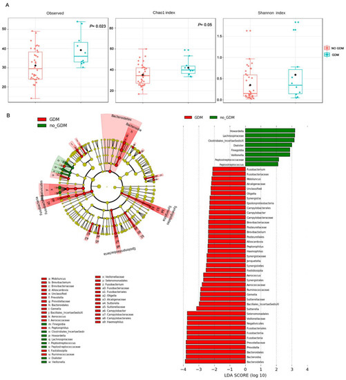 Vaginal microbiome profiles of women experiencing GDM during the pregnancy. (A) Alpha diversity (observed operational taxonomic units (OTUs), Chao I and Shannon indexes; p-values by Kruskal–Wallis test). (B) LEfSe analysis. Comparison of enriched taxa between vaginal samples of women with GDM and normal glucose-tolerant women. Results indicated the statistically significant taxa enrichment among groups (Alpha value = 0.05 for the factorial Kruskal–Wallis test among classes). The threshold for the logarithmic LDA score was 2.0.