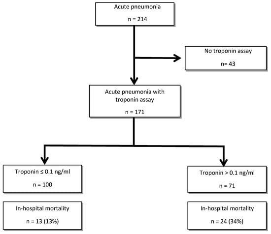 - Vestjens, S.M.T.; Spoorenberg, S.M.; Rijkers, G.T.; Grutters, J.C.; Berg, J.M.T.; Noordzij, P.G.; Van De Garde, E.M.; Bos, W.J.W.; the Ovidius Study Group. High-sensitivity cardiac troponin T predicts mortality after hospitalization for community-acquired pneumonia. Respirology 2017, 22, 1000–1006. [Google Scholar] [CrossRef] [PubMed]