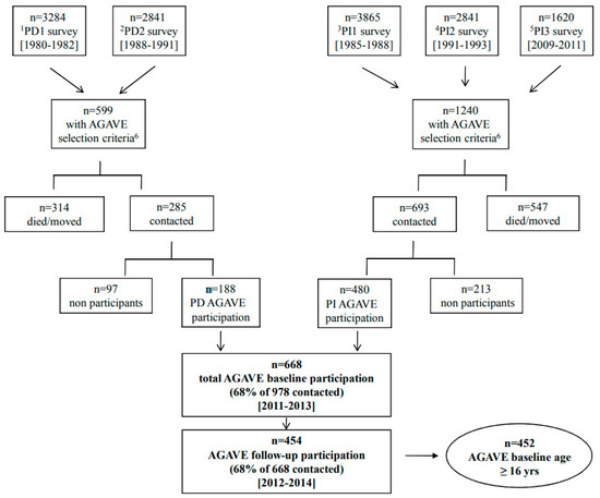 Flow-chart of subjects participation. 1PD1, Po Delta first survey; 2PD2, Po Delta second survey; 3PI1, Pisa first survey; 4PI2, Pisa second survey; 5PI3, Pisa third survey; 6AGAVE selection criteria: subjects reporting asthma diagnosis or asthma symptoms (asthma attacks or wheezing) in at least one of the previous epidemiological surveys.
