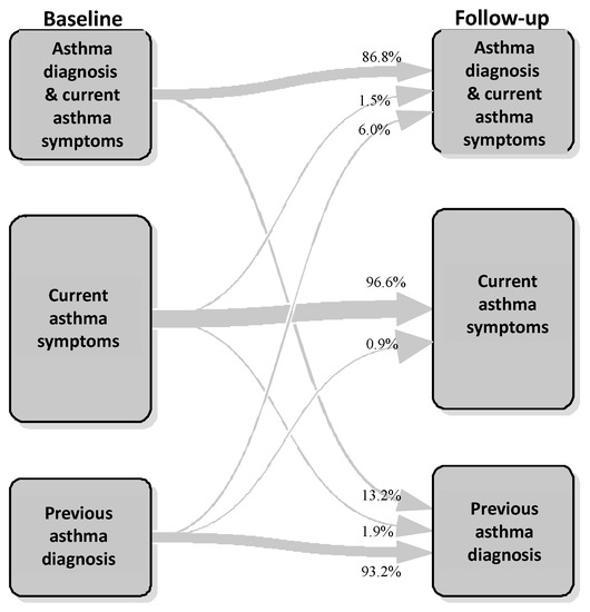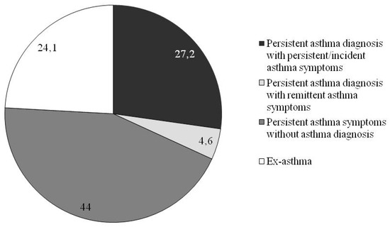 Based on the transition plot (Figure 2), the following longitudinal patterns were defined: “persistent asthma diagnosis with persistent/incident asthma symptoms”, i.e., subjects with asthma diagnosis reporting asthma symptoms (wheeze or asthma attacks) at both baseline and follow-up or reporting new asthma symptoms at follow-up (27.2%); “persistent asthma diagnosis with remittent asthma symptoms”, i.e., subjects with asthma diagnosis reporting asthma symptoms at baseline but not at follow-up (4.6%); “persistent asthma symptoms without asthma diagnosis”, i.e., subjects reporting only asthma symptoms, without lifetime asthma diagnosis, at both baseline and follow-up (44.0%); and “ex-asthma”, i.e., subjects reporting “previous asthma diagnosis” at both baseline and follow-up (24.1%) (Figure 3).