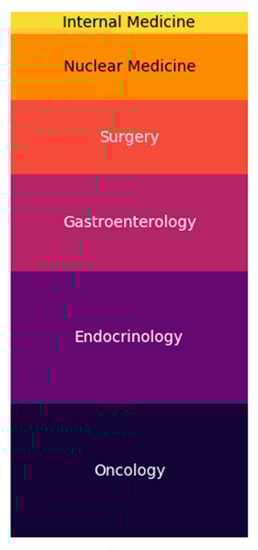 A total of 92 participants took part in the survey and 77.2% (n = 71) of the participants answered all questions completely. Most physicians worked in a university hospital (55%, n = 39), followed by non-university hospitals (30%, n = 21) and specialist practices (practice for internal medicine offering medical oncological treatment; 15%, n = 11). The question of clinical specialization was answered as follows: oncology (25%, n = 18), endocrinology (25%, n = 18), gastroenterology (18%, n = 13), surgery (14%, n = 10), nuclear medicine (13%, n = 9), internists (4%, n = 3) (Figure 1). In most facilities, more than 25 NET patients are treated annually (65%, n = 46). Typically, physicians spend 5–20% of their time treating NET patients. Only 6 participants spend more than 40% of their time on the care of NET patients.