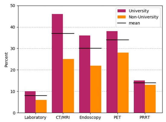 Patients with NET require a wide range of laboratory, endoscopic and radiological/nuclear medical procedures. Approximately 33% of the participants stated that there were delays in radiological/nuclear medical (CT/MRI 37%, n = 26), endoscopic workups (30%, n = 21) and with FDG/Ga68-PET/CT (34%, n = 24), with more extensive delays in the university sector (46% vs. 25%, 36% vs. 22% and 38% vs. 28%, see question C6, Figure 3). Minor delays occurred in laboratory medicine and PRRT. In 19 participants (27%), it was stated that there were no delays in general.