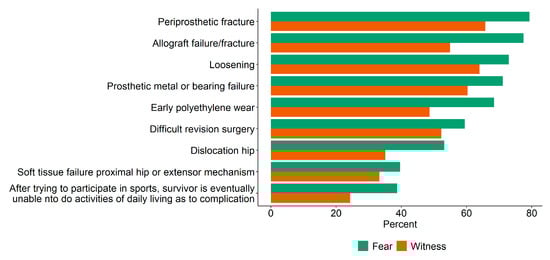Third, respondents were asked which of nine sports-activity-associated complications and failures they fear after modular bone–joint replacement in sarcoma survivors and which of these they had actually witnessed (see Figure 1. The “feared” to the “witnessed” complications were compared conducting McNemar tests and calculating odds ratios (see Section 3.3).