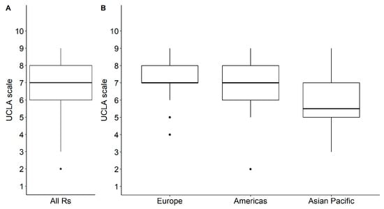 Box plot of responses to University of California, Los Angeles (UCLA) activity scale: (A) all respondents; (B) by region. UCLA Score: 1: Wholly inactive, dependent on others, and cannot leave residence; 2: Mostly inactive or restricted to minimum activities of daily living; 3: Sometimes participates in mild activities, such as walking, limited housework, and limited shopping; 4: Regularly participates in mild activities; 5: Sometimes participates in moderate activities such as swimming or could do unlimited housework or shopping; 6: Regularly participates in moderate activities; 7: Regularly participates in active events such as bicycling; 8: Regularly participates in active events, such as golf or bowling; 9: Sometimes participates in impact sports such as jogging, tennis, skiing, acrobatics, ballet, heavy labor, or backpacking; 10: Regularly participates in impact sports.