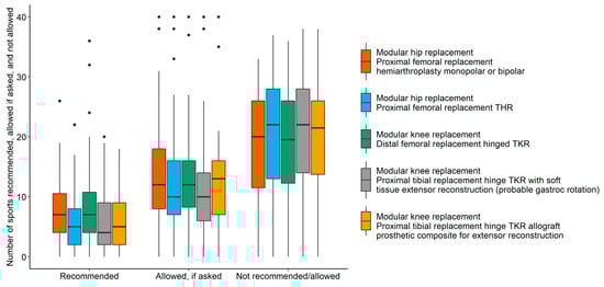 Sixty-four percent (95% CI: 51%–74%) of respondents reported being more likely to allow a patient to participate in a sport postoperatively if the patient had prior experience with this sport. Thirty-six percent (95% CI: 26%–49%) of respondents stated that it made no difference in recommendation when prior experience was evident. After proximal femoral replacement hemiarthroplasty, monopolar or bipolar, a median of seven (95% CI: 5–8) different sports were recommended by respondents; 12 (95% CI: 10–15) were allowed, if asked by the patient; and 20 (95% CI: 17–23) were not allowed (Figure 3). After proximal femoral replacement total hip replacement (THR), a median of five (95% CI: 3–7) sports were recommended; 10 (95% CI: 7–14) were allowed, if asked; and 22 (95% CI: 19–26) were not allowed. After distal femoral replacement hinged total knee replacement (TKR), a median of seven (95% CI: 5–8) sports were recommended; 12 (95% CI: 10–14) were allowed, if asked; and 19.5 (95% CI: 16–22) were not allowed, if asked. After proximal tibial replacement hinge TKR with soft tissue extensor reconstruction probable gastrocnemius rotation, a median of four (95% CI: 3–7) sports were recommended; 10 (95% CI: 9–13) were allowed, if asked; and 22 (95% CI: 19–26) were not allowed. After proximal tibial replacement hinge TKR allograft prosthetic composite for extensor reconstruction, a median of five (95% CI: 3–7) sports were recommended; 13 (95% CI: 10–15) were allowed, if asked; and 21.5 (95% CI: 16–26) were not allowed. Walking, swimming, and stationary bicycling were the most often recommended sporting activities after surgery (Table 3).