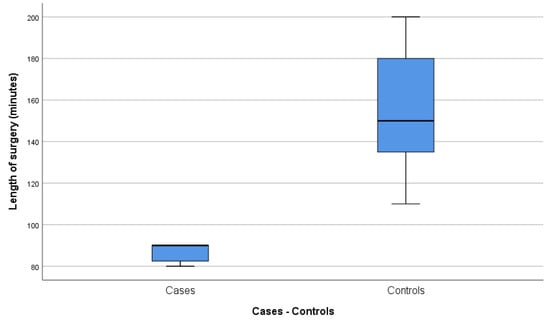 The average length of surgery was 86.43 ± 4.75 (95% CI 82.03–90.83) minutes for the case group and 155.56 ± 28.44 (95% CI 133.69–177.42) minutes for the control group, the difference being statistically significant (p < 0.05). In addition, the box diagram (Figure 1) illustrates that the length of most of the surgical procedures in the case group was below average, while it was above average for patients in the control group.