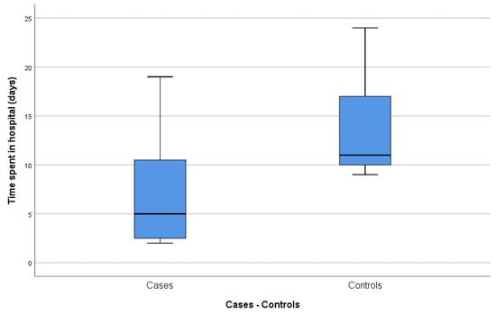 With regard to the length of hospitalization after surgery (Figure 2), the case group registered an average of 7.43 ± 6.6 (95% CI 1.32–13.54) days, while the average length for the control group was 13.44 ± 5.1 (95% CI 9.52–17.37) days. The case group registered an abnormally large interval due to the fact that the patient with Morris syndrome, who subsequently dropped out of the study, spent a long time in the hospital. For this reason, after eliminating this patient from the database, we obtained an even lower average hospitalization time for the case group, 5.50 ± 4.5 (95% CI 0.68–10.32) days, and a statistically significant difference between both groups (p = 0.012).