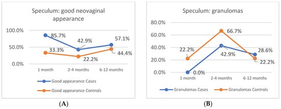 With regard to the evolution of the neovagina through speculoscopy, an assessment of the presence of granulomas, infection and foul-smelling discharge was completed, in addition to determination of whether a good appearance was attained. The findings for both groups were grouped into month 1, months 2–4 and months 6–12 visits. The line graph illustrates that the presence of granulomas was lower in the case group in the first two visits with a better neovaginal appearance throughout the follow-up procedure for this group (Figure 3).