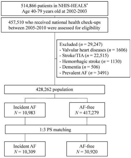 Flowchart of the enrollment procedure of the study population and analyses. TIA, transient ischemic attack; AF, atrial fibrillation. * The National Health Insurance Service-Health Screening Cohort (NHIS-HEALS) in Korea.