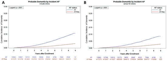 Compared to the group without AF, the cumulative incidence of dementia was higher in the incident-AF group (log-rank p < 0.001, Figure 2A). Among patients with incident AF, 880 (8.0%) participants developed dementia during 77,851 person-years of follow-up, compared with 9172 participants (2.2%) who developed dementia among patients without AF during 3,033,519 person-years. The incidence of dementia was 11.3 and 3.0 per 1000 person-years in the incident-AF and without-AF groups, respectively.
