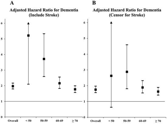 Hazard ratios for dementia per decade of age in the presence of AF. (A) Including stroke during the follow-up; (B) excluding stroke during the follow-up. The hazard ratios are expressed as boxes, the 95% confidence intervals are expressed as limit lines, and the horizontal line (at hazard ratio 1) indicates no difference in hazard ratios between the AF and the without-AF groups.