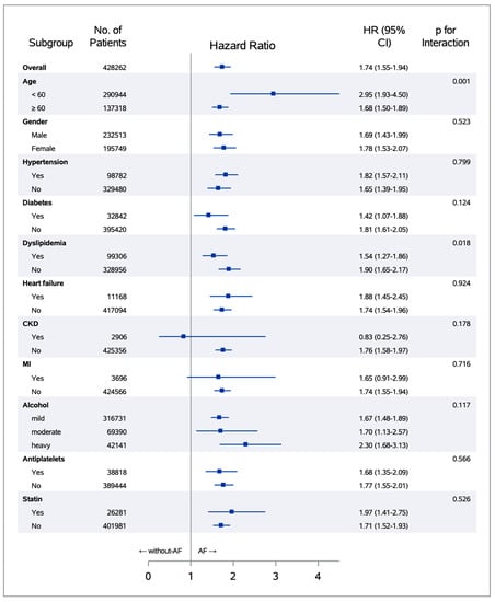 The risk of dementia was significantly increased in all subgroups of the incident-AF group compared to the without-AF group, except in patients with chronic kidney disease and previous myocardial infarction (Figure 4).