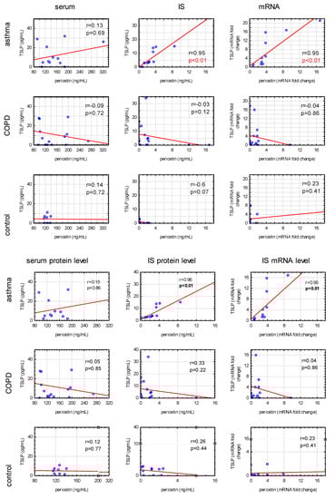 A strong positive correlation between IS periostin and TSLP protein levels (r = 0.95, p < 0.001) as well as mRNA expression level (r = 0.95, p < 0.001) was found in patients with asthma (Figure 1). There were neither significant correlations between serum periostin and TSLP levels in asthma nor IS or serum periostin and TSLP levels (or their mRNA expression) in the COPD and control groups (Figure 1).