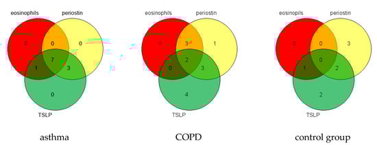 Most patients with concomitantly elevated levels of sputum eosinophils, periostin, and TSLP also had also increased IL-4 and IL-13 concentrations (6/7 patients for both cytokines, which represents 50% of the asthma group). In the COPD group, only one person had simultaneously raised levels of sputum eosinophils, periostin, TSLP, IL-4, and IL-13.