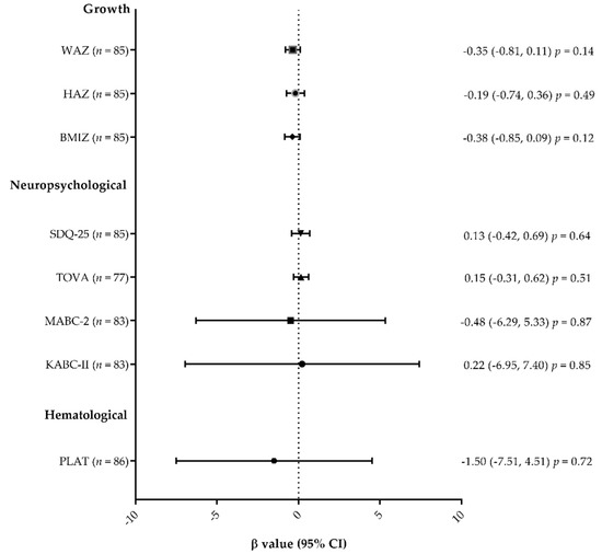 Forest plot of the association between anthropometric, hematological, and neuropsychological outcomes at year 6 with CHEU having a mtDNA depletion at week 50, using linear regressions. β values and confidence intervals are shown. Analyses were adjusted for gender and prophylactic treatment regimen. Abbreviations: WAZ, weight-for-age z-score; HAZ, height-for-age z-score; BMIZ, body mass index z-score; SDQ-25, Strengths and Difficulties Questionnaire; TOVA, Test of Variable of Attention; MABC-2, Movement Assessment Battery for Children—second edition; KABC-II, Kaufman Assessment Battery for Children—second edition; PLAT, platelet count; CI, confidence interval.