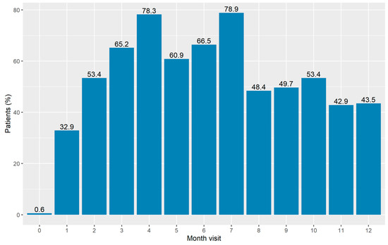 Two-hundred and eighty-one chronic-phase CML patients were included in this subanalysis. Median age at TKI discontinuation was 60.1 (IQR—interquartile range: 48.2–69.8) years and median follow-up since TFR was 2.3 years (IQR 2.0–3.1). For this cohort the median duration of sustained DMRs before treatment interruption was 3.3 years (IQR 2.3–5.9). In this timeframe every patient had a mean of 7.8 (±4.7) appointments for molecular evaluation. Overall, 2203 analyses were performed, of which 17.9% happened in the first three months and 38.4% in the first six months. During the first three months of TKI discontinuation, 59 patients (21%) did not have any molecular assessment; 1 qPCR was performed for 93 patients (33.1%), 2 qPCRs for 88 patients (31.3%), 3 qPCRs for 39 patients (13.9%) and 4 qPCRs for two patients (0.7%). For the first six months after TKI stop, 9 patients (3.2%) did not undergo any BCR-ABL1 evaluation; 55 patients (19.6%) only underwent one analysis, 72 patients (25.6%) underwent two analyses, 38 patients (13.5%) underwent three analyses, 30 patients (10.7%) were evaluated four times, 51 patients (18.1%) five times, 25 patients (8.9%) six times and only 1 patient (0.4%) seven times. The majority of visits fell between the third and the seventh month after TKI interruption (Figure 1) with 105 patients (65.2%) evaluated at month 3, 126 patients (78.3%) at month 4, 98 patients (60.9%) at month 5, 107 patients (66.5%) at month 6 and 127 patients (78.9%) at month 7.