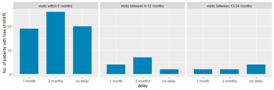 Finally, we evaluated the number of patients who would experience a delay in the diagnosis of MMR loss (and consequently a delay in treatment resumption) if a three-month monitoring schedule was adopted. In the first 6 months, 19 patients (29.2%) would have a one-month delay, 26 (40%) a 2-month delay; 20 patients (30.8%) would experience no delay. Very few patients would experience a delay in the following months (Figure 2).