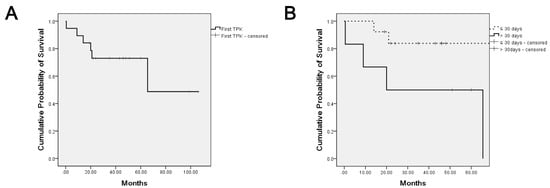 In addition, the median time from TPK to infection recurrence was estimated and compared using the Kaplan-Meier survival curves between patients who received TPK within 30 days after infection presentation and those who received TPK after 30 days. The overall median time to recurrence was 17 months, after an infection-free period post-TPK, while recurrence-free state at 1 year and 2 years post-TPK were 89.5% and 73.0%, respectively (Figure 1A). Recurrence-free state at 1 year was 100% for patients that received TPK within 30 days of disease presentation, and 66.7% for those after 30 days. Recurrence-free state at 2 years was 83.9% for patients who had TPK within 30 days of infection presentation and 50.0% for those after 30 days. Further statistical analysis revealed that the median time to recurrence was significantly shorter in eyes receiving TPK, after 30 days of infection than in those receiving TPK within 30 days (14.5 months vs. 17.5 months, p = 0.030, Figure 1B).