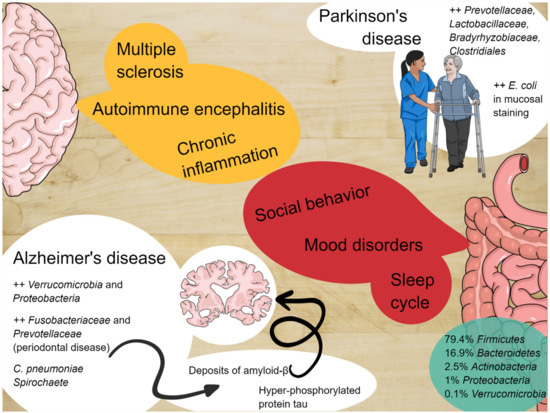 Alzheimer’s disease (AD) is a chronic and irreversible neurodegenerative disease, characterized by a loss of neurons and progressive impairments in the synaptic function, accompanied by deposition of the amyloid-β (Aβ) peptide outside or around neurons, together with an accumulation of hyper-phosphorylated protein tau inside cortical neurons [70,71,72,73,74]. Amyloid accumulation, involving the deposition of hyperphosphorylated tau proteins, with consequent microtubule destabilization, leads to two critical processes: An essential increase of general neuro-inflammation, and significant microglial and astrocytic activation and starvation of the neurons, due to the interruption of axonal transport. The most important consequences are the altered glutamatergic currents and the critical calcium inflow currents, with the significant induction of apoptosis [73,75,76,77]. Animal models of amyloid and tau depositions are related to herpes simplex virus type 1 (HSV1) infection in mice that upregulates the encoding genes for cholesterol 25-hydroxylase (CH25H), which seems to be involved in amyloid altered catabolism or hyper-production [78,79,80]. Nevertheless, many other bacteria have been related to the essential neuro-inflammatory status, typical of AD, such as spirochaete, and Chlamydia pneumoniae [78,81,82]. A positive relationship with phosphorylated tau and phosphorylated tau/Abeta 42 in cerebrospinal fluid and microbiota metabolism has been found with an elevation of trimethylamine N-oxide in AD models [83]. Moreover, transgenic wild-type amyloid precursor protein (APP) mice and germ-free mice have a diminished level of amyloid deposition compared to APP mice with a healthy microbiota [84], and this has also been proved in long-term spectrum antibiotic treatment, which seems to reduce amyloid depositions [85]. It has been described that AD mice have severe quotes of Verrucomicrobia and Proteobacteria, with a concomitant reduction of Ruminococcus and Butyricicoccus and short-chain fatty acids [86,87]. Moreover, poor oral hygiene has been linked to AD, with parodontopathy and tooth loss being risk factors for dementia in two studies [88,89], as well as severe periodontitis related to lower cognitive functions [90,91,92,93,94,95,96,97]. Even if studies have many different biases, it has been demonstrated that periodontal disease may be related to an increased brain amyloid load through PET studies [93], and that there is an increase of Fusobacteriaceae and higher abundance of Prevotellaceae in AD patients [93,98].