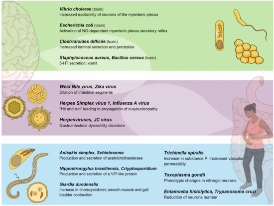Some cases of intestinal dysmotility disorders seem to be related to viral infection [170,171,172]. In mice models, inoculation with neurotropic flaviviruses leads to the injury and death of enteric neurons, inflammation, intestinal dilation, and retarded bowel transit. More precisely, the inoculation of mice with the flaviviruses West Nile virus (WNV) and Zika virus (ZIKV) leads to viral replication throughout the intestinal tract and the dilation of intestinal segments. Viral replication has been specifically observed within enteric neurons, causing cell death, but not in glial cells or mucosal epithelial cells. In addition, animals surviving WNV infection show defects in gastrointestinal motility from 4 to 7 weeks after infection. Overall, these observations support the hypothesis that some gastrointestinal dysmotility disorders may be episodic following infection/inflammation or chronic, which can be periodically exacerbated by additional infections or inflammation [173].