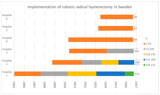 In Sweden, RRHs were first implemented in 2005. Later implementations were aided by study visits and proctoring by surgeons from either of the two institutions with the earliest start ensuring a homogenous surgical approach among all centers. RRHs rapidly became the primary approach of choice, initially limited by robot access at some institutions. Laparoscopic RHs were never implemented in Sweden.