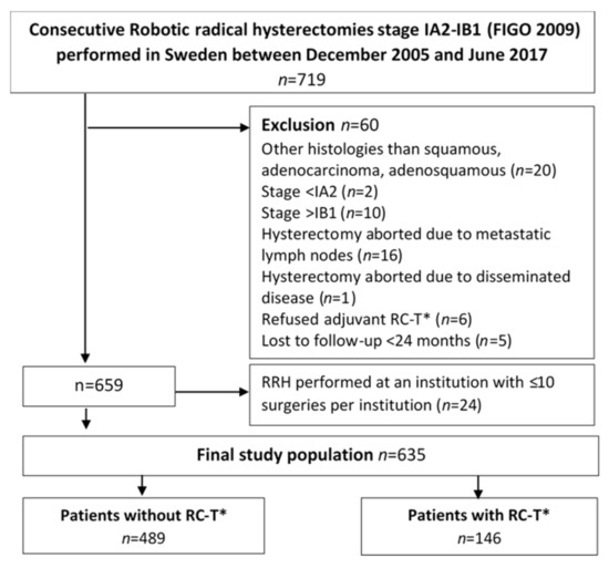 All women in Sweden ≥ 18 years with a preoperative stage IA2-IB1 (FIGO 2009) with squamous adenocarcinoma or adenosquamous histology who underwent pelvic lymphadenectomy and an RRH according to Querleu–Morrow classification types B2 or C1 (or similar to the classification at the one clinic performing RRHs before 2008) from the first RRHs performed from December 2005 to June 2017 were included [16,17]. All RRHs were performed without the use of an intrauterine manipulator. Women converted to open surgery were included on an intention to treat basis. The women were identified by, and data retrieved from, the Swedish Quality Register of Gynecologic Cancer (SQRGC) and controlled by a review of local hospital registers to identify any missing women in the national quality register [6]. A full chart review was thereafter performed on all women by three of the authors (L.E, E.W and E.A) to control and harmonize the existing register data according to predefined common criteria regarding demographic information, age, body mass index (BMI) kg/m2, smoking status, tumor histology, FIGO stage, tumor grade, LVSI, tumor size, lymph node status in the pathology report, adjuvant treatment, all intraoperative and postoperative complications within 30 days, and time and site of recurrences within 24 months (which was the total follow up time in all women). Per institution, operations were chronologically numbered. Tumor size was defined as the largest diameter in a preoperative cone biopsy or hysterectomy specimens, hence representing the minimum size of the tumor. Women with a tumor size > 40 mm at final pathology, positive lymph nodes or women with margins of <5 mm (this included women with parametrial involvement) were recommended adjuvant RC-T. Neither depth invasion, LVSI nor grade were used as separate parameters influencing primary or postoperative treatment. Intraoperative complications (defined as a complications diagnosed and treated during primary surgery, or directly related to surgery but diagnosed postoperatively) and postoperative complications up to 30 days post-surgery were registered; the latter using the Clavien–Dindo classification [18]. Exclusion criteria were high-risk histology, FIGO 2009 stage <1A2 or >1B1, intraoperative abortion of the RRH in favor of RC-T, an unwillingness to receive recommended adjuvant treatment or loss to follow up within 24 months. All inhabitants in Sweden are assigned a unique personal identification number used for population registration and in health care. Health care for cancer is only provided by public hospitals. Hence, a woman was only lost to follow up if she emigrated abroad.