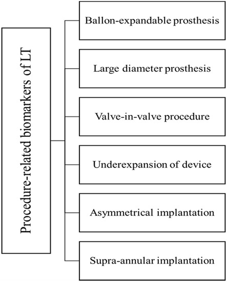 The currently known procedure-related predictors of LT in transcatheter heart valves (THVs) include (i) underexpansion and asymmetrical implantation of the valve, (ii) balloon-expandable prosthesis, (iii) large-diameter prosthesis, (iv) supra-annular implantation and (v) valve-in-valve procedure (ViV-TAVI). The procedural characteristics predisposing to LT after TAVI are summarized in Figure 1.