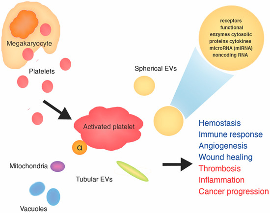 Platelets are anuclear fragments of megakaryocytes involved in hemostasis, immune response, angiogenesis and wound healing. On the other hand, platelets contribute to thrombosis, inflammation and cancer progression [55]. Because activated platelets release numerous mediators from their α-granules, secrete pro-inflammatory organelles like mitochondria and vacuoles and release extracellular vesicles (EVs), indicators of platelet activation have been studied as potential biomarkers of thrombosis [55]. The platelet-based mechanisms which might potentially underlie LT after TAVI are presented in Figure 2.