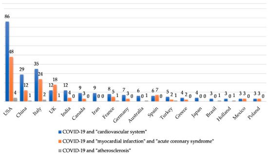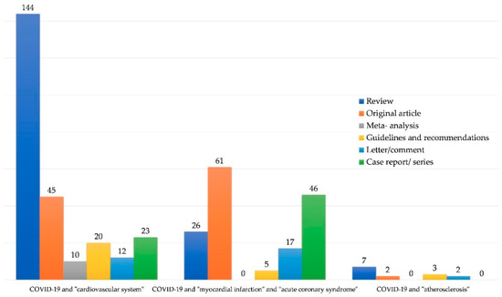 We performed an analysis of the PubMed, Cochrane, Google Scholar and MEDLINE databases. We used the terms “COVID-19”, “SARS-CoV-2”, “n-CoV2” linked with “cardiovascular system”, “atherosclerosis”, “heart”, “AMI”, “ACS”, “acute myocardial infarction” and “acute coronary syndrome”. Most articles in similar fields (for example “cardiovascular system” and “heart” as well as “AMI” and “acute myocardial infarction”) overlapped and the decision was made to use the most representative key words, which were: “COVID-19”, “SARS-CoV-2”, “n-CoV2” linked with “cardiovascular system”, “atherosclerosis”, “acute myocardial infarction”, and “acute coronary syndrome”. As of September 15, 2020, the results were as follows: for “COVID-19” (and substitute words) and “cardiovascular system” we obtained 687 results; for “COVID-19” (and substitute words) and “myocardial infarction” together with “COVID-19” (and substitute words) and “acute coronary syndrome” we obtained 328 results; for “COVID-19” (and substitute words) and “atherosclerosis” we obtained 57 results. Some of them did not fulfill the search criteria or were concerned with the field of neurology. Only articles written in English, German and Polish were analyzed, for a total number of 432 papers. The distribution of articles by country is presented in Figure 1 (by keywords) and Figure 2 (by article type). Countries publishing fewer than two articles were not presented in the chart.